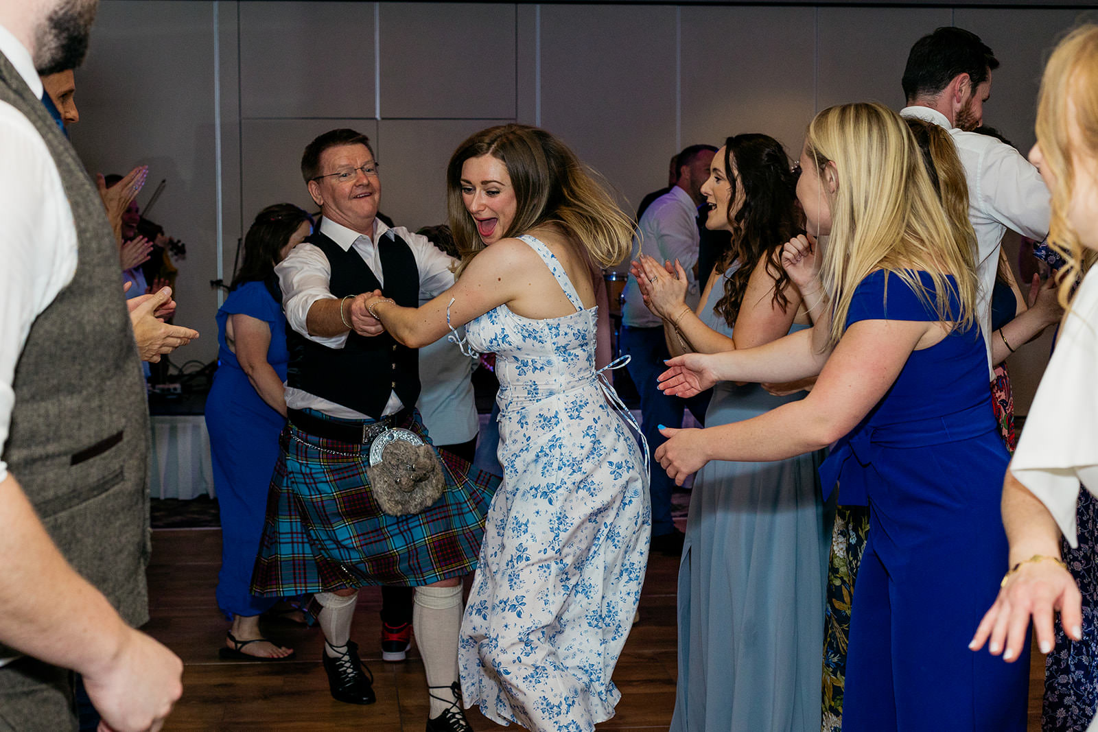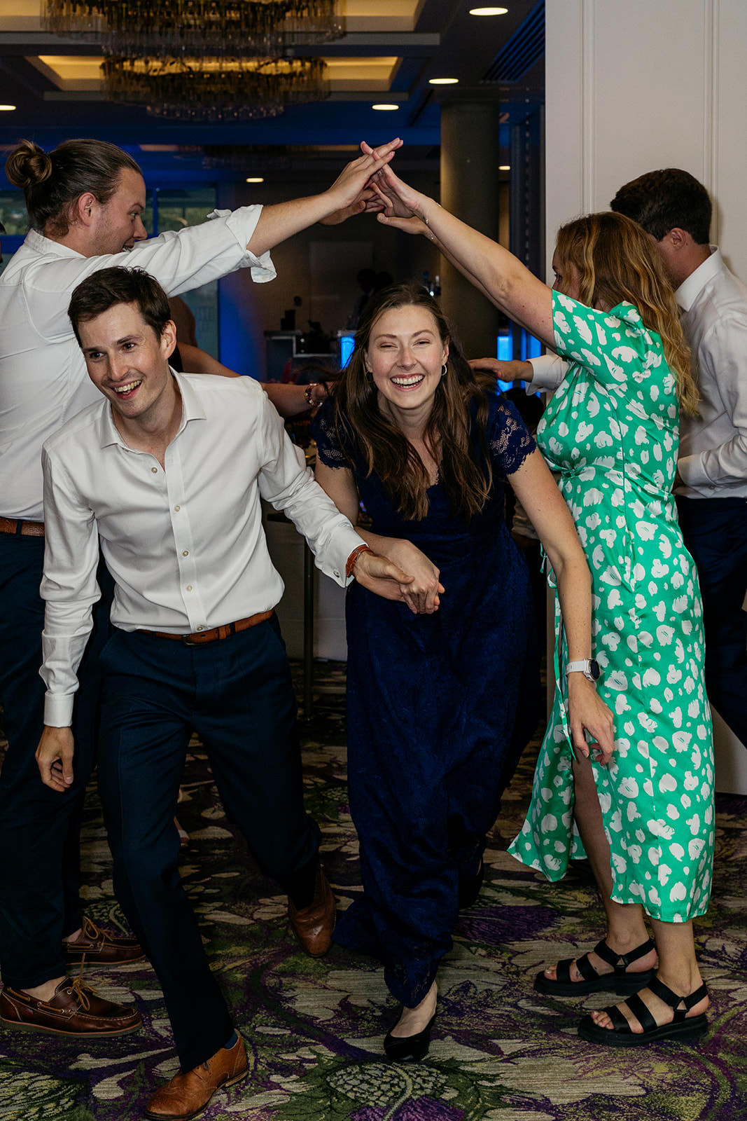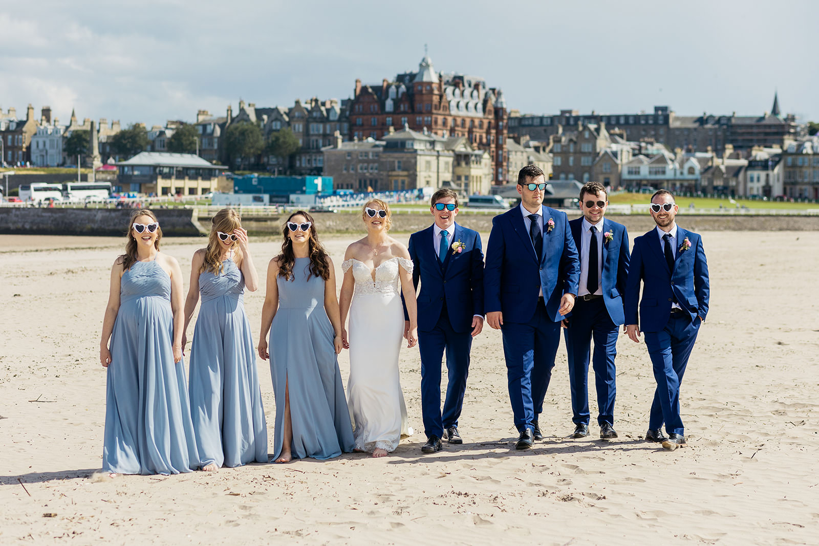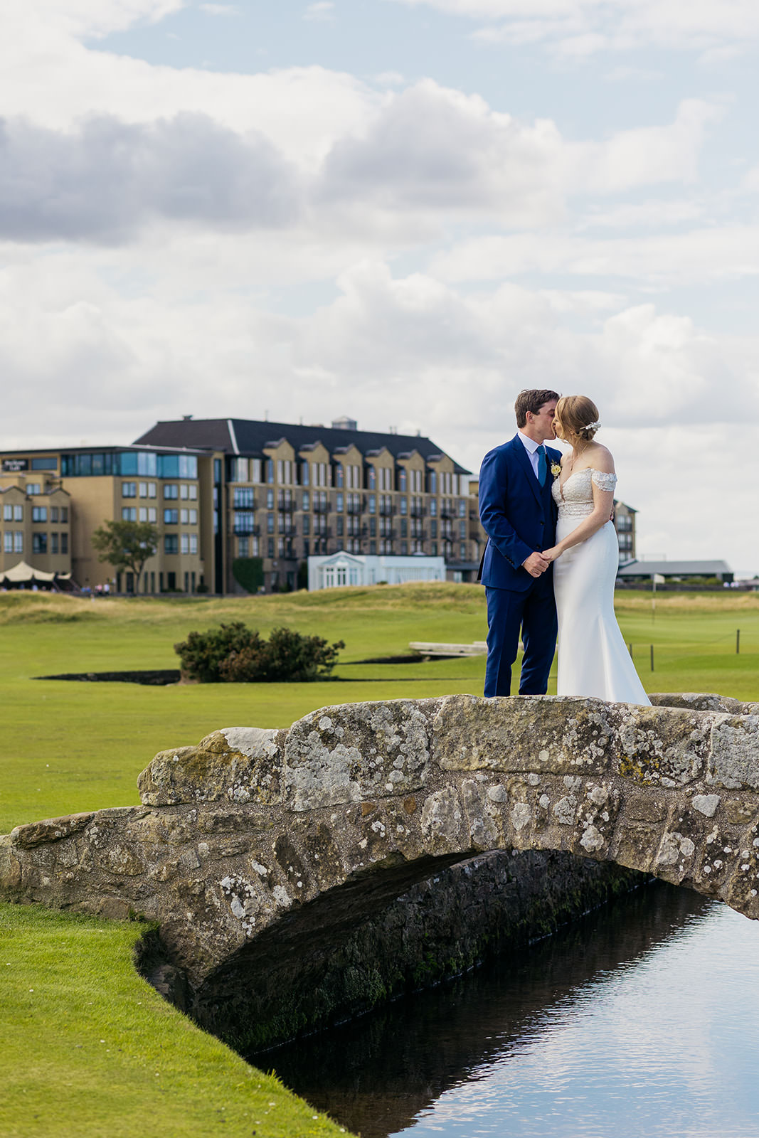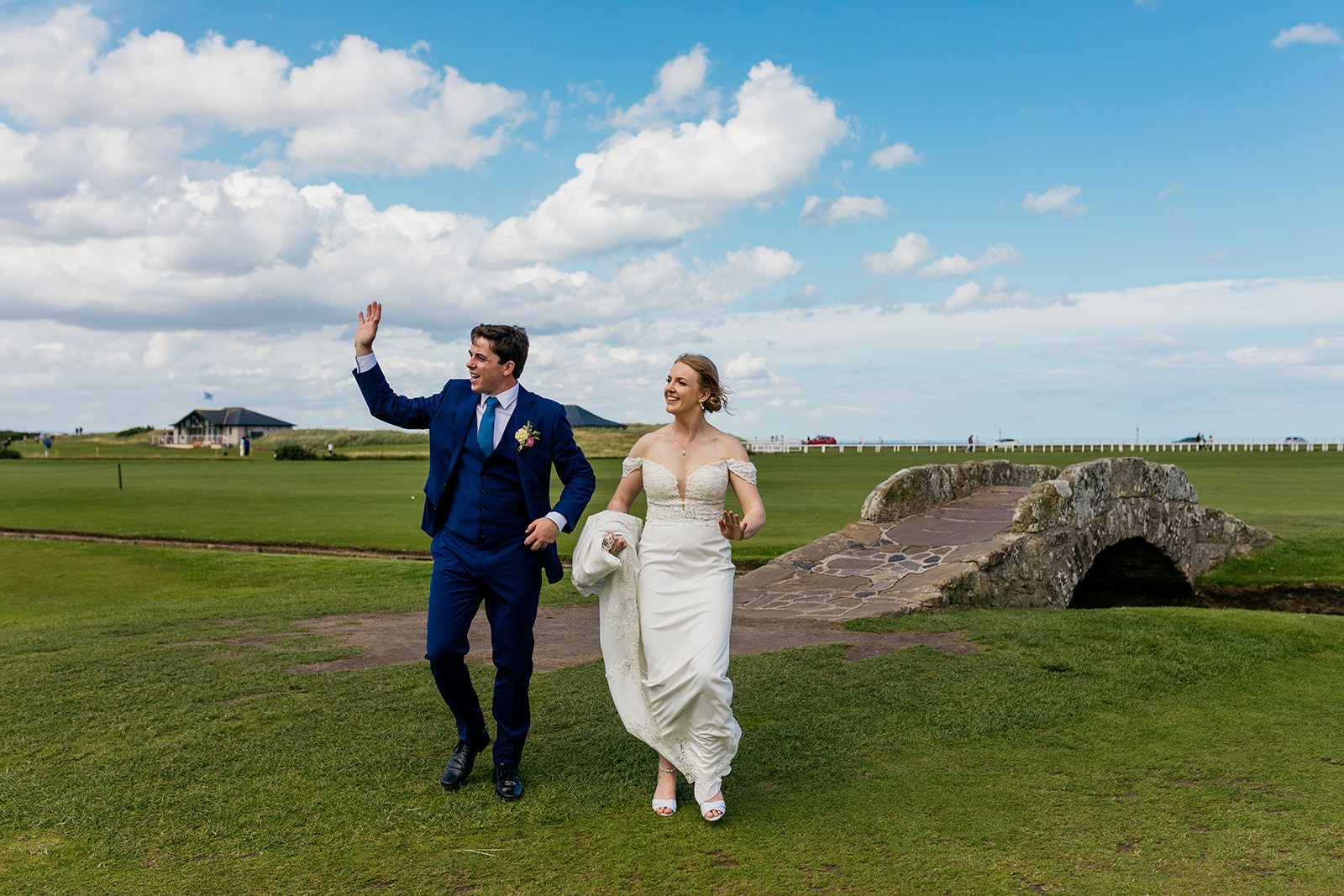 We made sure to take some time to drive down to West Sands for their couple’s session, accompanied by the bridesmaids and groomsmen. We did a few photos on the boardwalk. As soon as we got there, two staff members at Dook came over to give Ben & Chloe a couple of mini prosecco bottles. Such a kind thing to do. We, of course, also headed to the Swilcan Bridge in between play to grab a quick photo. Other honourable mentions should go to their friend Laura for making their cake, as well as It’s No Reel for the fantastic ceilidh music. The Old Course is a perfect venue for a wedding. The conservatory for the ceremony is gorgeous. The Hall of Champions for the speeches and dinner has enough space for all your guests to be up on the dance floor.