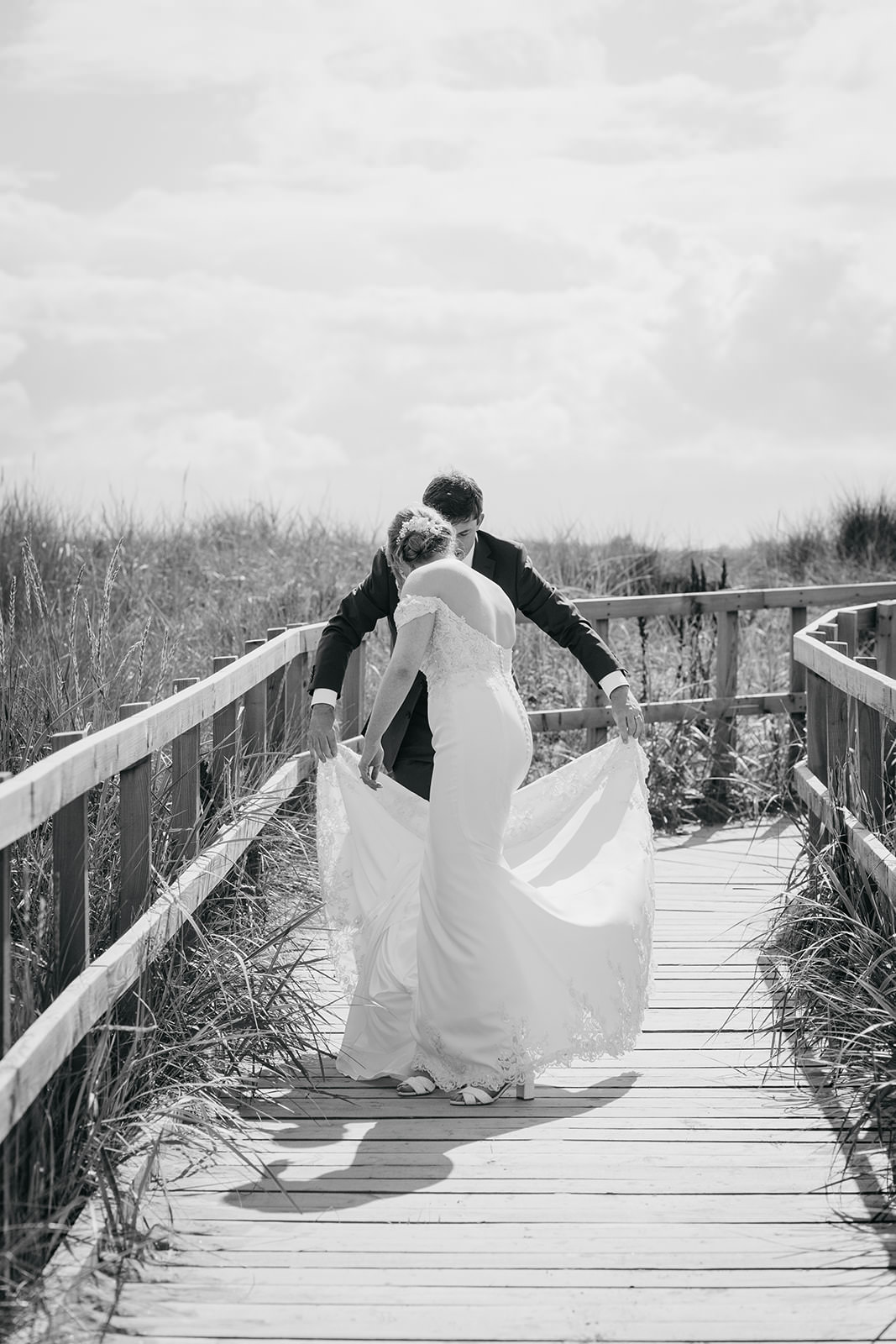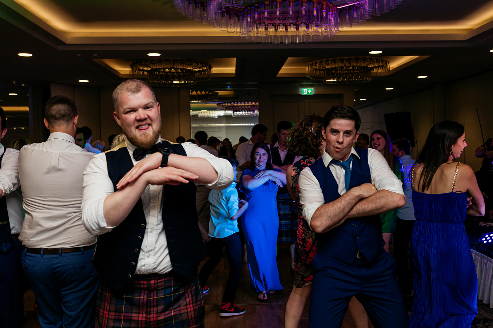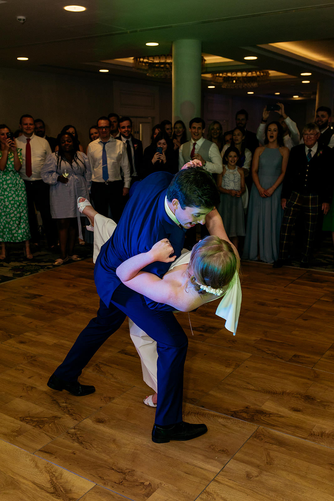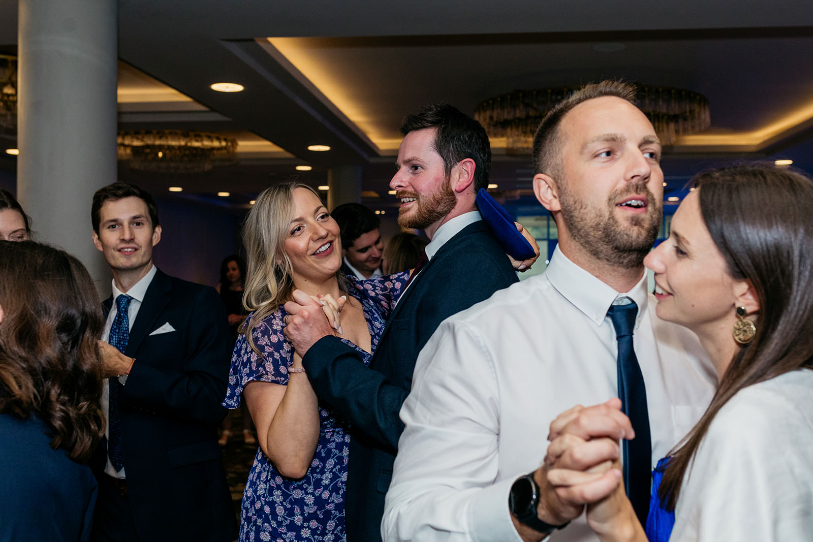 We made sure to take some time to drive down to West Sands for their couple’s session, accompanied by the bridesmaids and groomsmen. We did a few photos on the boardwalk. As soon as we got there, two staff members at Dook came over to give Ben & Chloe a couple of mini prosecco bottles. Such a kind thing to do. We, of course, also headed to the Swilcan Bridge in between play to grab a quick photo. Other honourable mentions should go to their friend Laura for making their cake, as well as It’s No Reel for the fantastic ceilidh music. The Old Course is a perfect venue for a wedding. The conservatory for the ceremony is gorgeous. The Hall of Champions for the speeches and dinner has enough space for all your guests to be up on the dance floor.