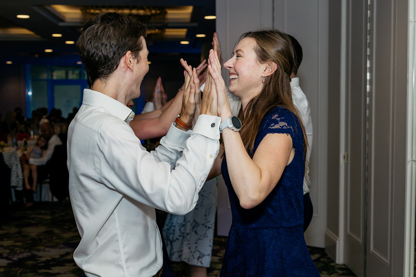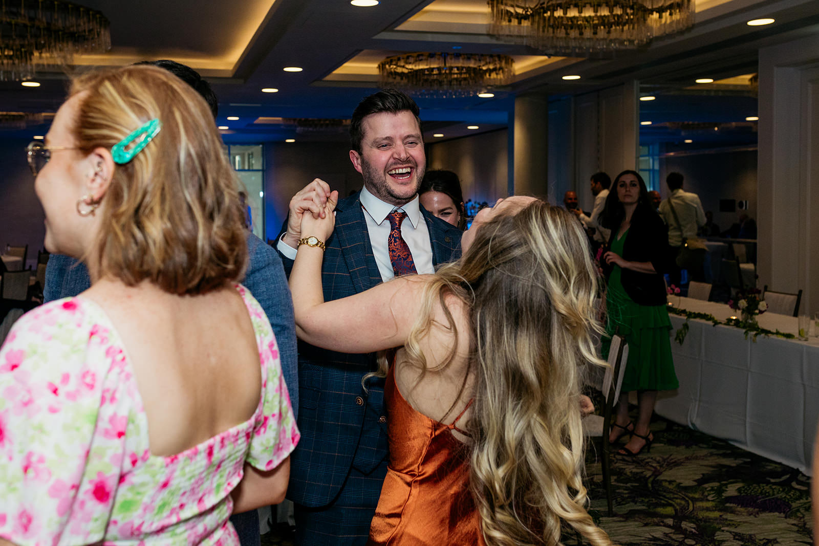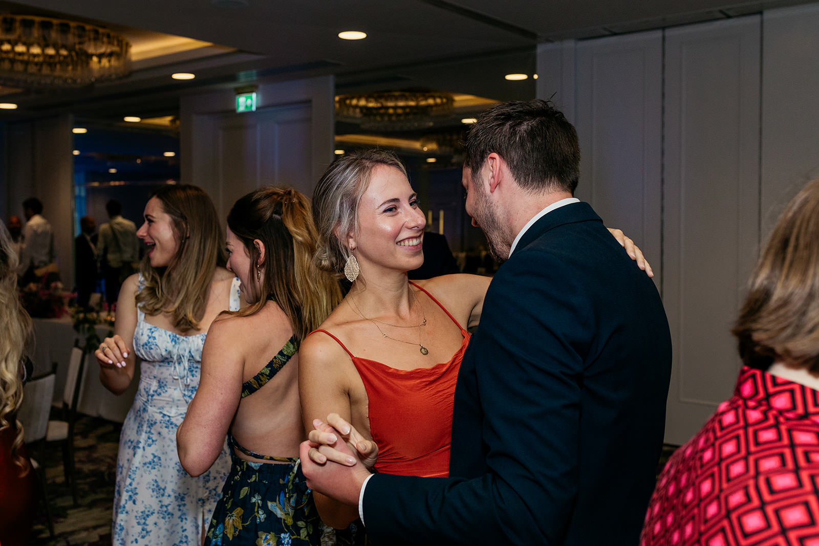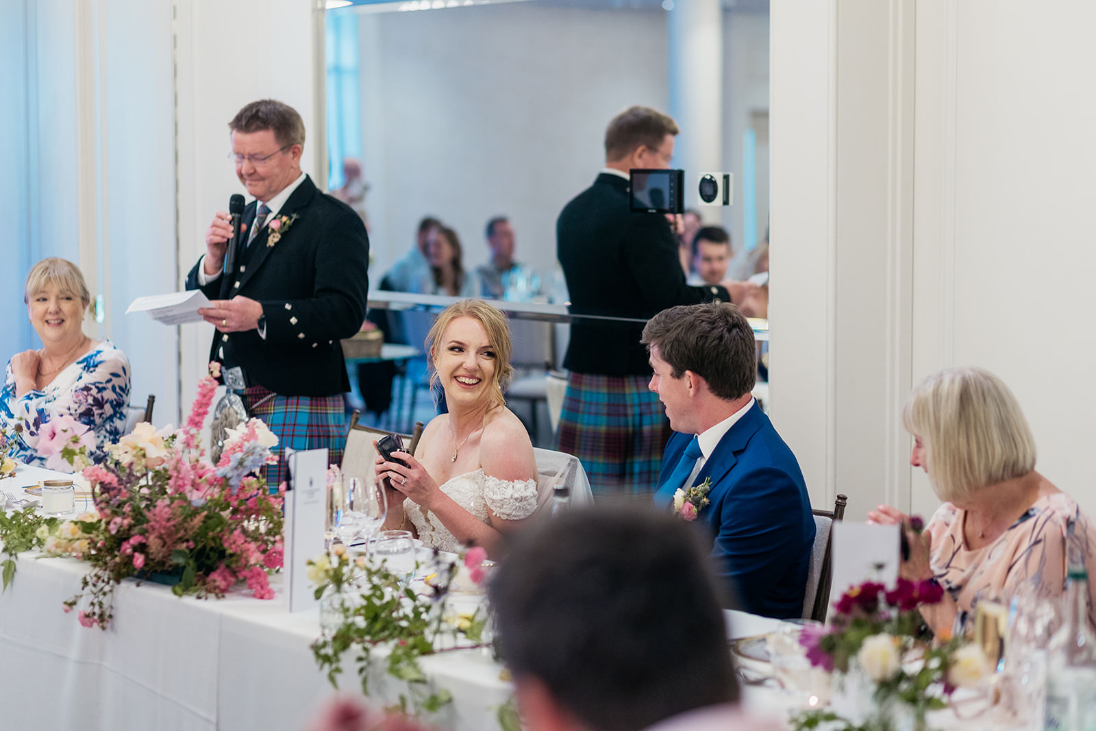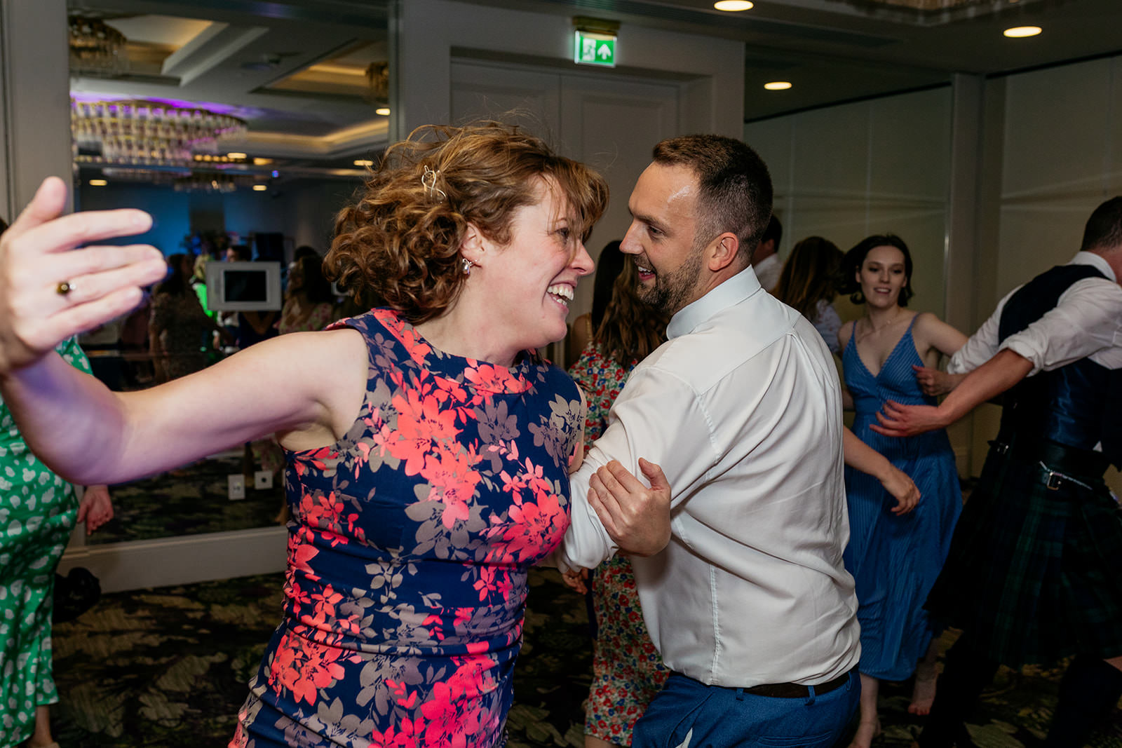 We made sure to take some time to drive down to West Sands for their couple’s session, accompanied by the bridesmaids and groomsmen. We did a few photos on the boardwalk. As soon as we got there, two staff members at Dook came over to give Ben & Chloe a couple of mini prosecco bottles. Such a kind thing to do. We, of course, also headed to the Swilcan Bridge in between play to grab a quick photo. Other honourable mentions should go to their friend Laura for making their cake, as well as It’s No Reel for the fantastic ceilidh music. The Old Course is a perfect venue for a wedding. The conservatory for the ceremony is gorgeous. The Hall of Champions for the speeches and dinner has enough space for all your guests to be up on the dance floor.